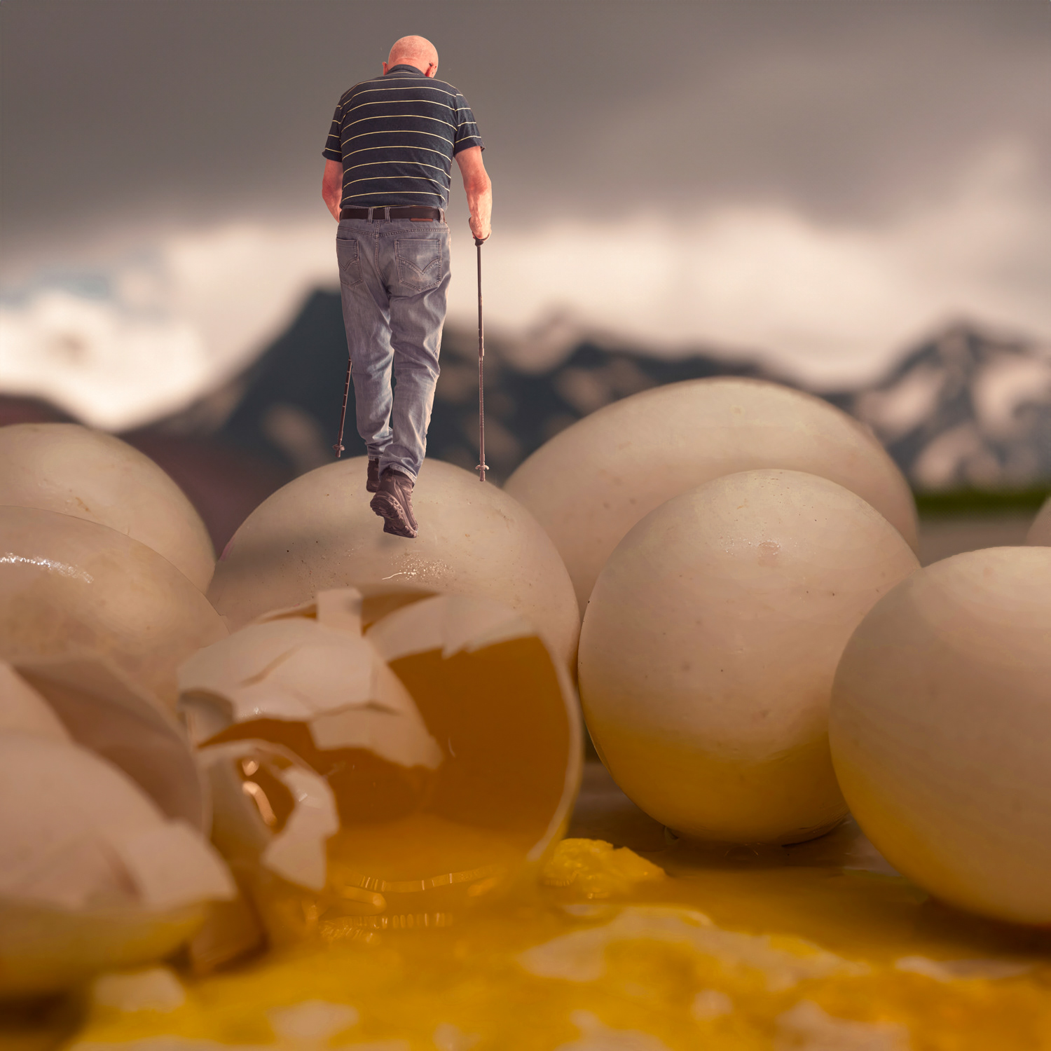 Stepping on Eggshells I - Precarious strides across fragile ground — a quiet metaphor for navigating the unbearable.