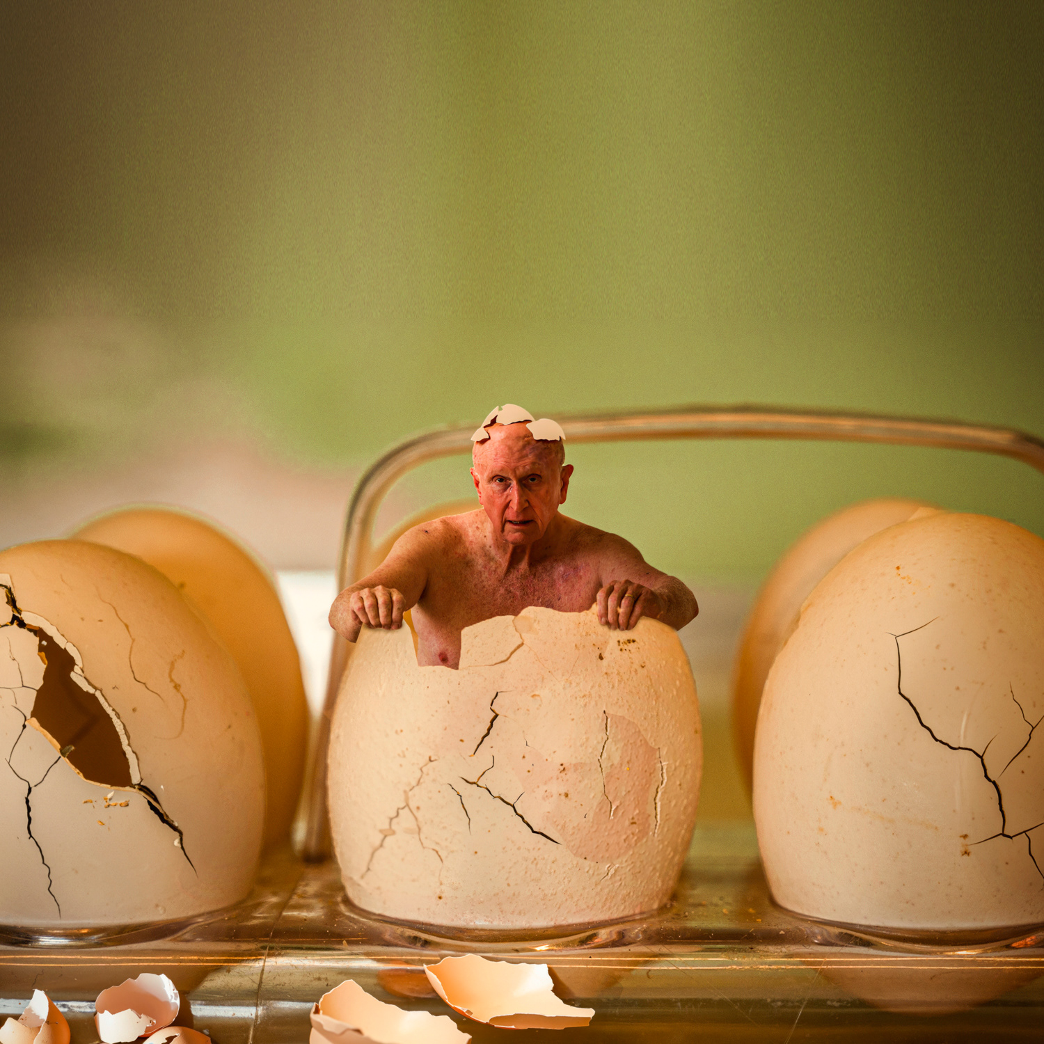 In this series, I return to the most elemental of symbols: a closed world, a beginning, a shell that must be broken for life to emerge. Sometimes cosmic, sometimes comic, always contemplative, these images explore themes of rebirth, transformation, vulnerability, and absurdity.