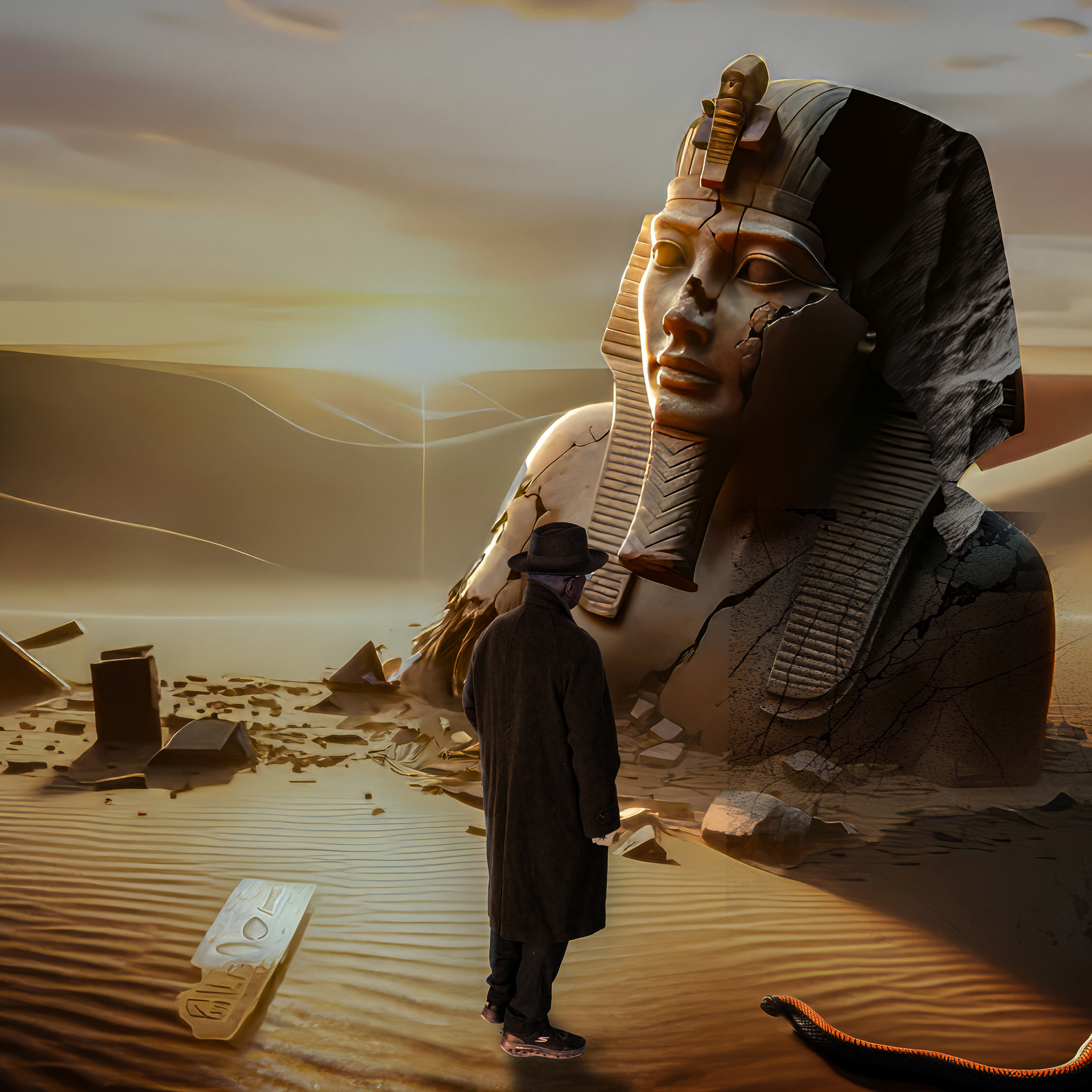 Ozymandias - Once a king, now a ruin—watched by a wanderer who knows his sandstorm is coming.